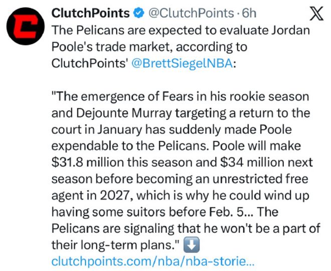 近日名记Siegel报道,随着今年首轮7号秀费尔斯的崛起,以及默里将在明年1月份回归,普尔在鹈鹕队内的地位突然变得可有可无,已经被摆上货架评估他的交易价值,不会是球队长期计划的一部分。